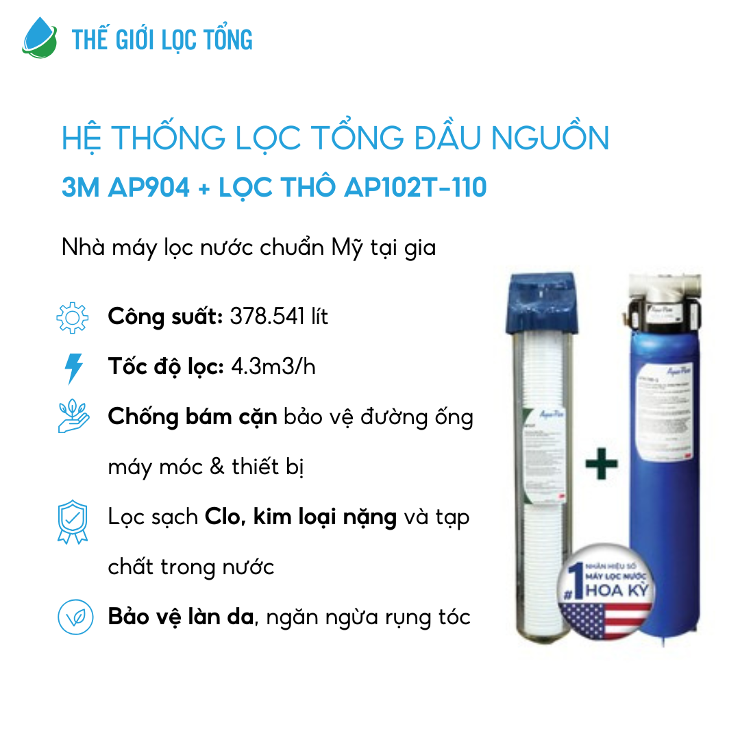 | Vật liệu | Bộ lọc 3M AP904: - Màng lọc không dệt xếp ly 6 lần (giảm cặn, trầm tích, gỉ sét) - Khối carbon cao cấp (giảm clo, mùi, vị) - Đầu thép không gỉ, chống ăn mòn, đạt chuẩn FDA CFR-21 Bộ lọc thô: - Vỏ nhựa trong suốt dễ quan sát - Màng lọc không dệt đạt chuẩn FDA CFR-21 |