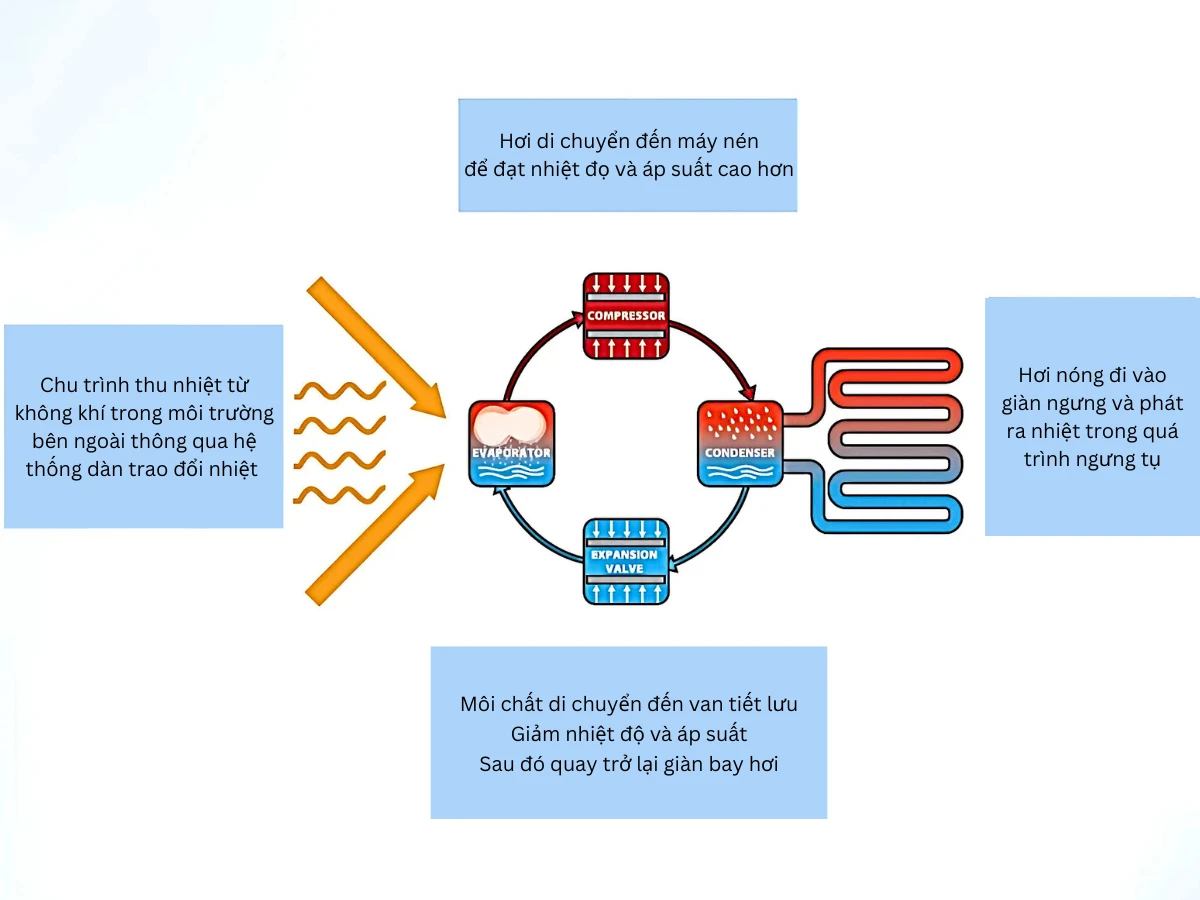 • Chu trình thu nhiệt: Máy hấp thụ nhiệt từ không khí bên ngoài qua dàn trao đổi nhiệt. Môi chất R134a hấp thụ nhiệt, chuyển từ lỏng sang khí, sau đó được dẫn vào máy nén.