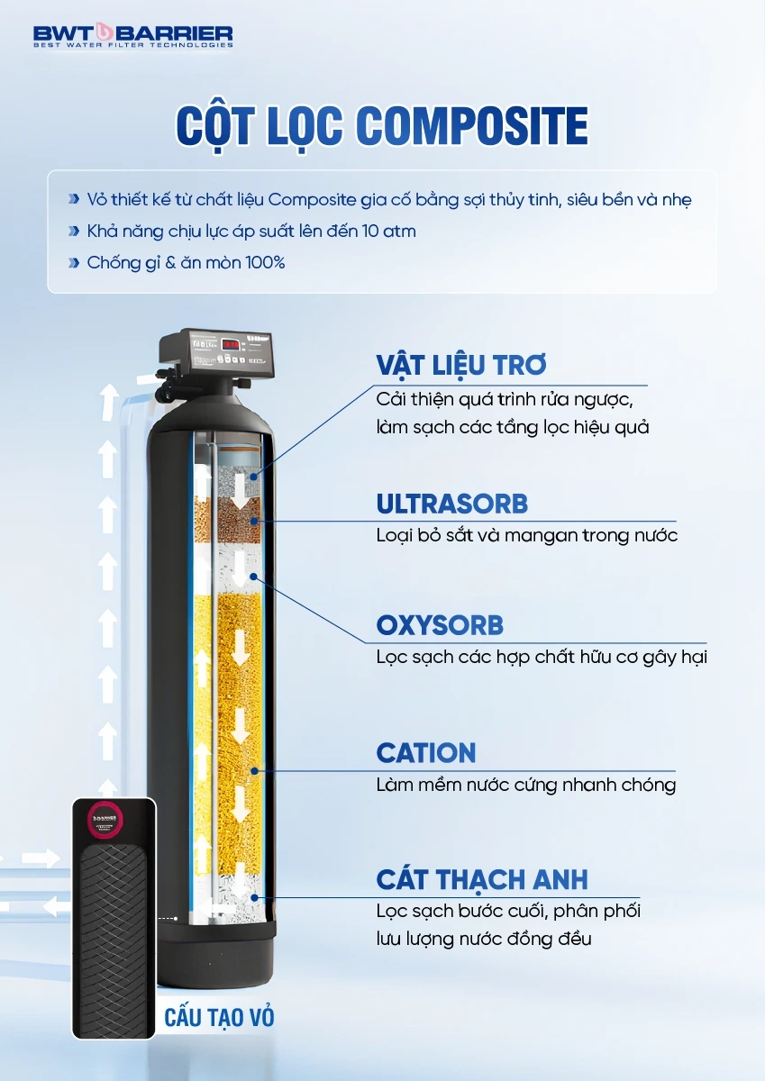 Các vật liệu lọc bao gồm cát thạch anh, than hoạt tính hay sỏi lọc có tác dụng loại bỏ cặn lơ lửng, khử phèn sắt và hấp thụ một phần hợp chất hữu cơ cùng clo tồn dư. Khi nguồn nước đi qua tầng lọc thô, các hạt bẩn, tạp chất và chất gây ô nhiễm sẽ bị giữ lại trên bề mặt vật liệu lọc. Tầng lọc thô không những giúp cải thiện độ trong của nước mà còn có tác dụng giảm áp lực cho các bước lọc tinh tiếp theo, duy trì hiệu suất tối ưu cho cả hệ thống.